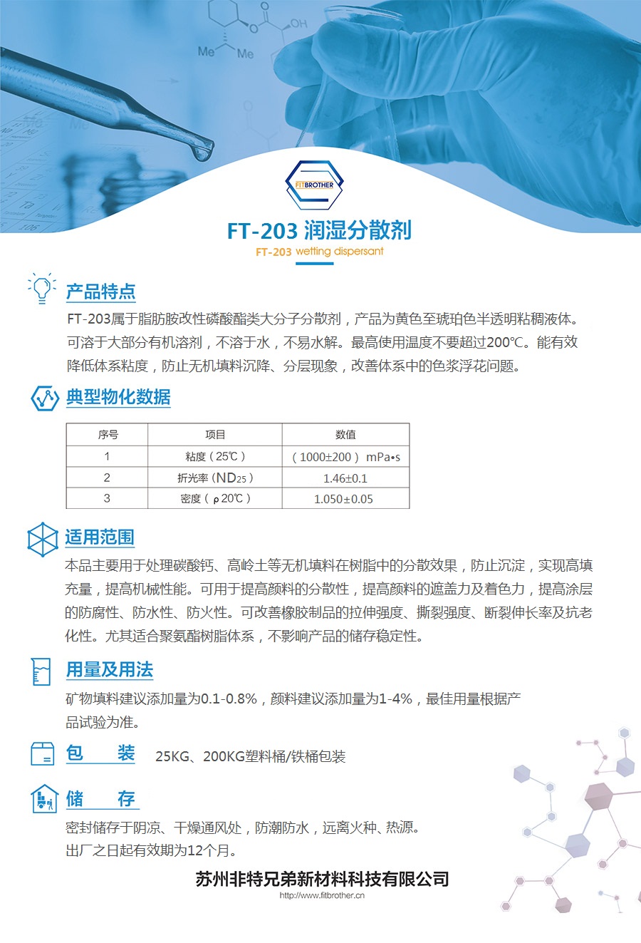 FT-203屬于脂肪胺改性磷酸酯類大分子環保型分散劑,產品為黃色至琥珀色半透明粘稠液體。可溶于大部分有機溶劑,不溶于水,不易水解。最高使用溫度不要超過200℃。能有效降低體系粘度,防止無機填料沉降、分層現象,改善體系中的色漿浮花問題。